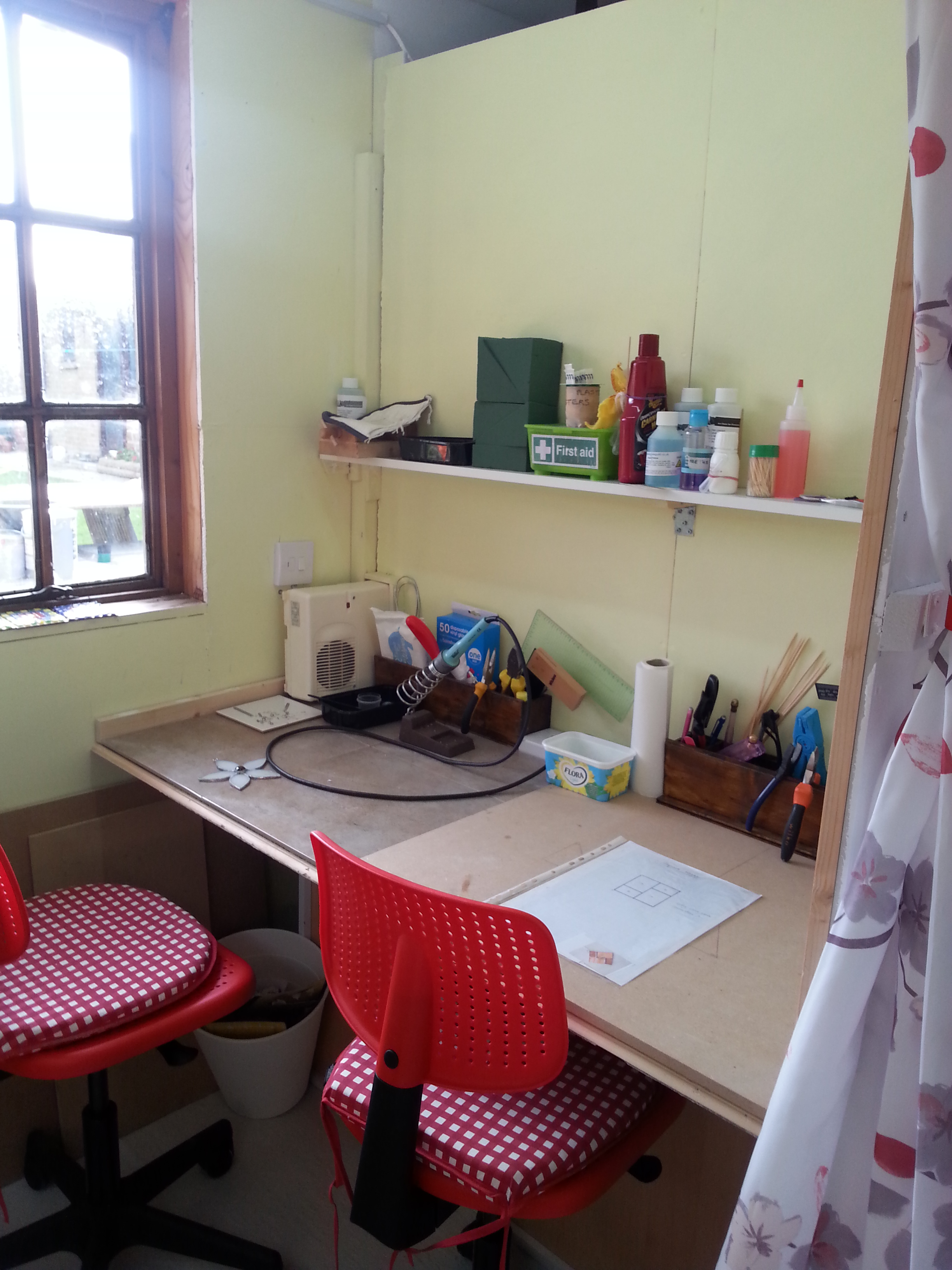 To catch you up…we have been converting part of our large shed to a workshop for me and now it’s live and working fantastically. I can sit and make glass objects with all my tools handy to my needs.