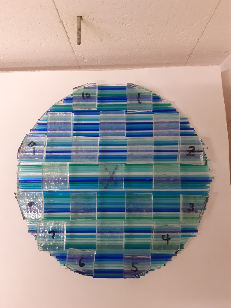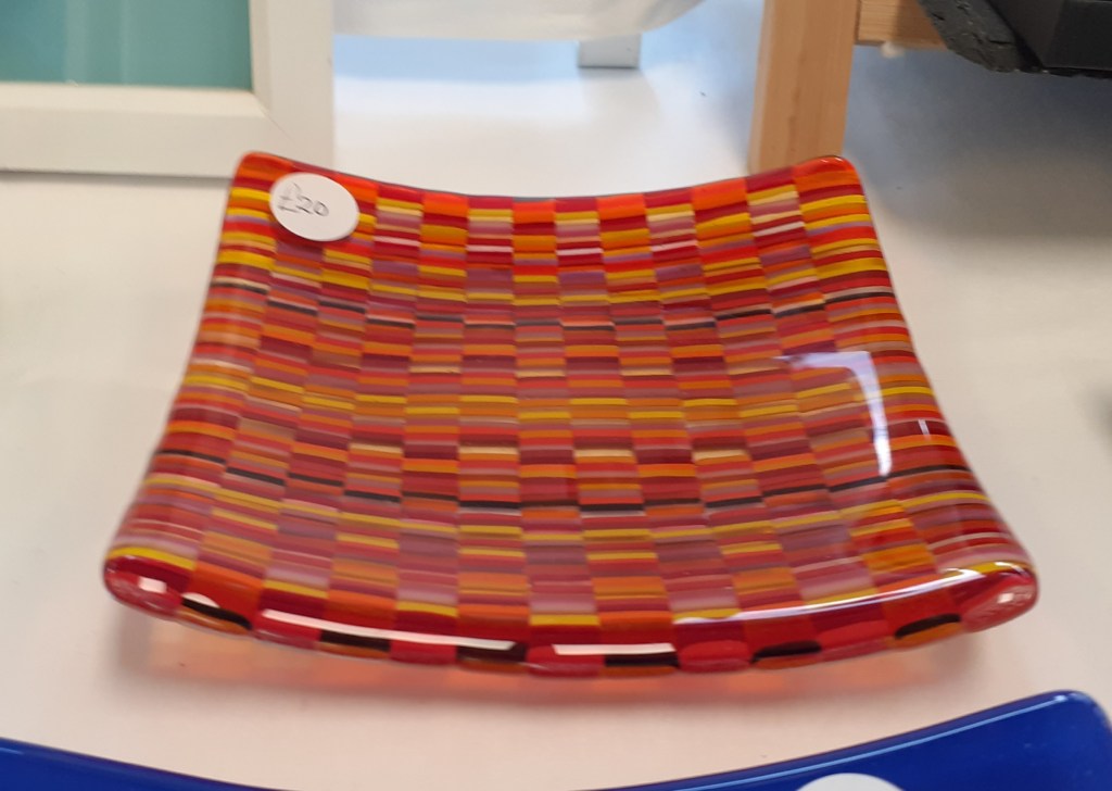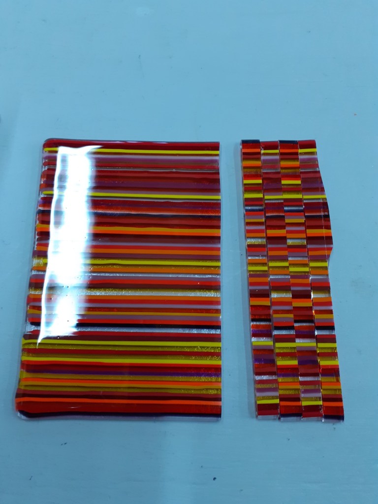 This is made by fusing stringers onto a clear base, cutting the pieces into strips, turning alternate ones round, fusing with a clear glass cover and, voila…