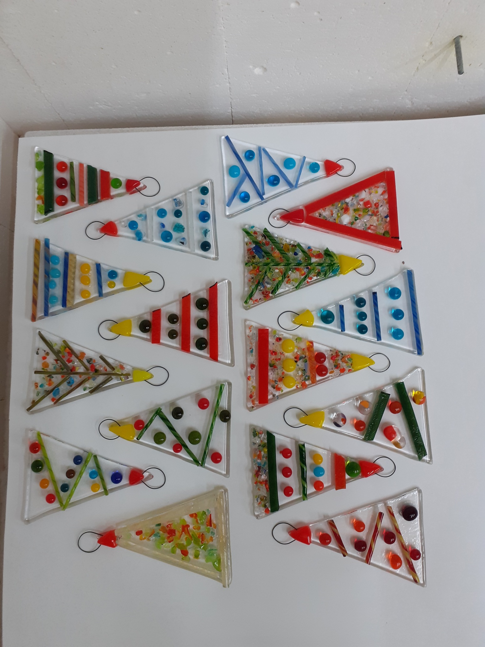 The workshop lasts one hour and is £20 per person. You can decorate four Christmas trees with lots of pretty glassy bits. They are about 8cm tall. I will fire them in my kiln and they will be ready for collection during the following week. There will be a postage fee if required.