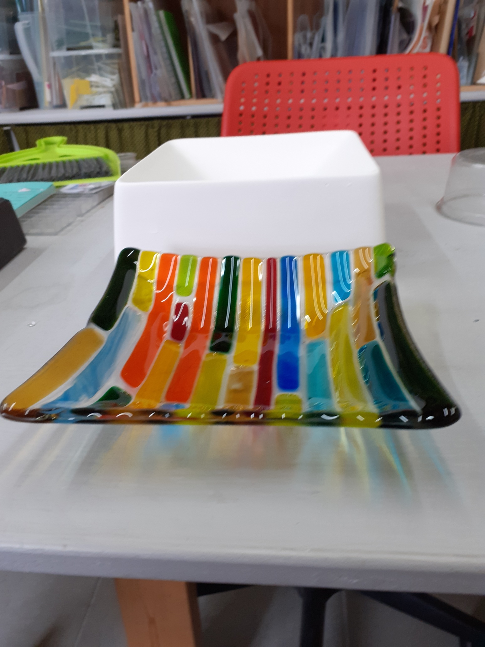 This is a dish in its various stages. First, the coloured glass is cut into strips and placed on a clear piece of glass. It is fired flat in the kiln (first picture).