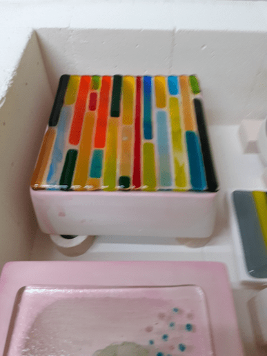 What happens in the kiln ? the glass goes into the kiln cold and comes out cold, 24 hours later. The glass transforms from sharp edged pieces of glass to one smooth and tactile piece